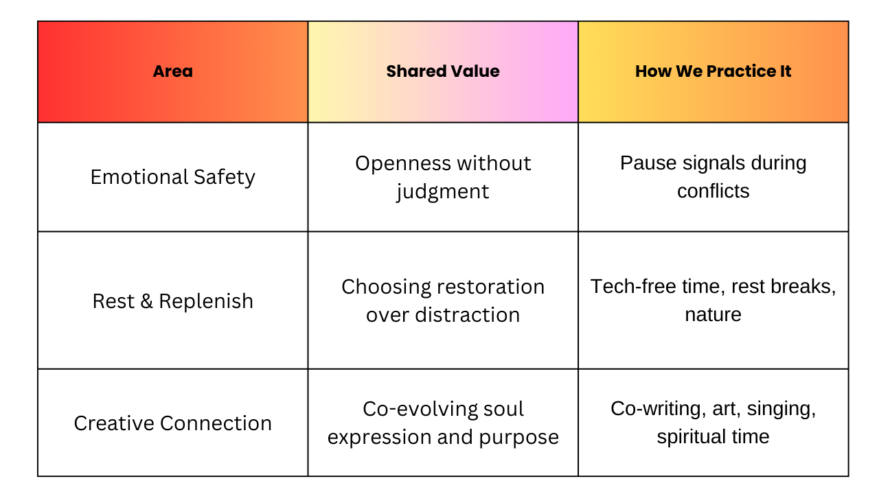 - Return to your relational agreements: use them as anchors when chaos clouds clarity.