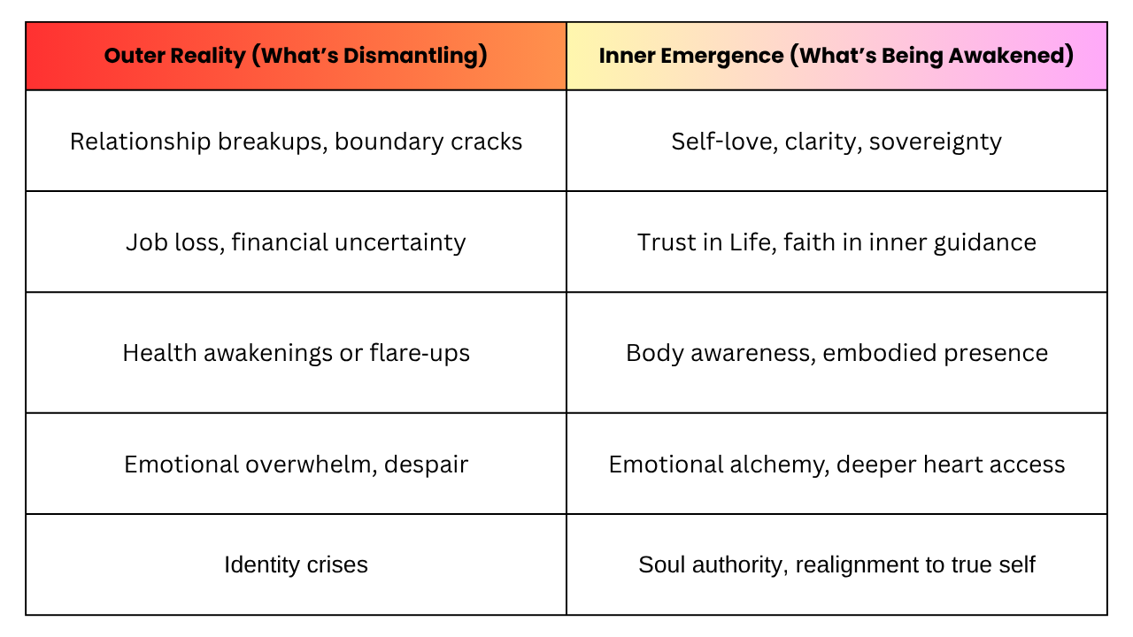 It looks messy at times. It shows up as relationship cracks. It becomes financial pressures or health flare-ups. It leaps into your emotional or psychic field — everything feels heightened.