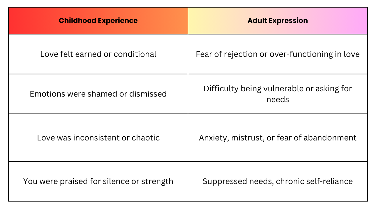 What your childhood never taught you about love can still be learned. Not through chasing or fixing, but through remembering. Love isn’t something you must earn, prove, or perfect. It is your essence. And healing is the journey of returning to that truth.