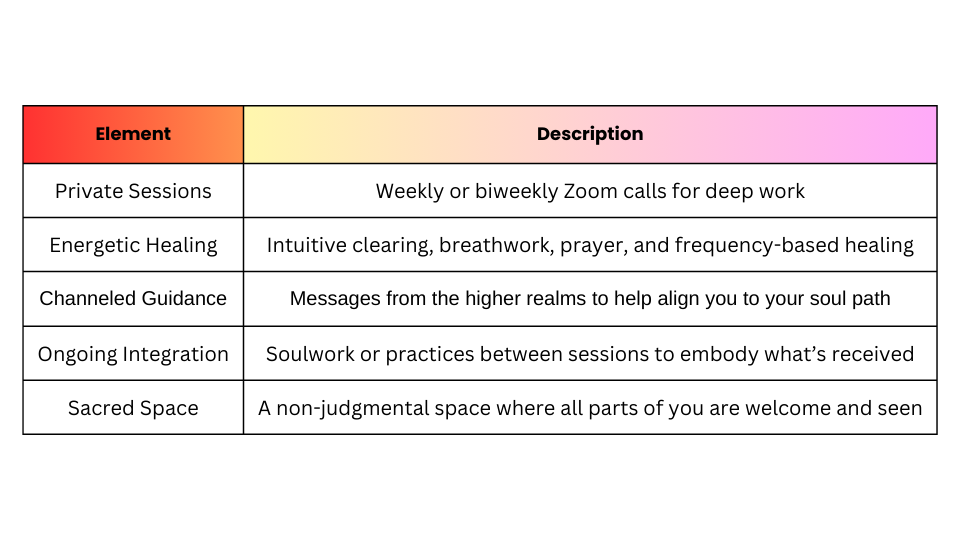 - One-on-one sacred container for emotional and energetic healing